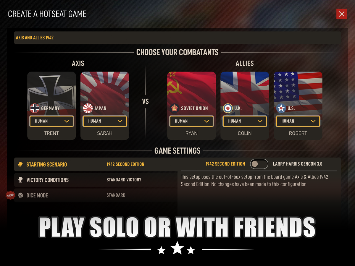 Axis & Allies 1942 Online is the official digital version of Hasbro’s strategy classic—Axis & Allies 1942 Second Edition! Play with friends, challenge the world’s top players, or go solo vs. AI. This board game fits your screen & schedule— get notified on your turn & command armies at your own pace.