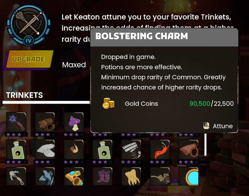 When visiting the Emporium, you’ll find a list of all of the trinkets and their powers. It’s an invaluable resource for learning about some of the most valuable gear to be found in your adventures. Even more importantly, the Emporium allows you to spend gold to “attune” with trinkets, increasing the likelihood that the ones you choose will appear in the dungeon at a higher rarity and—in the case of Mythic Tier attunement—even guarantee a higher minimum rarity.